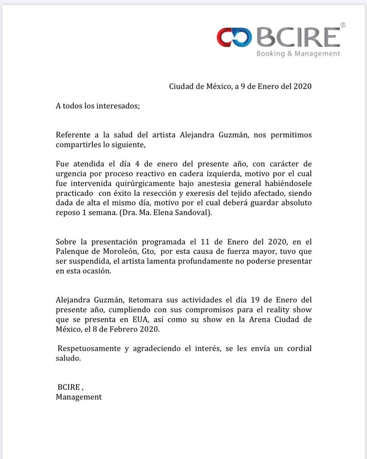 “Alejandra Guzmán retomará sus actividades el día 19 de enero del presente año, cumpliendo con sus compromisos para el reality show que se presenta en EUA, así como su show en la Arena Ciudad de México, el 8 de febrero de 2020”.